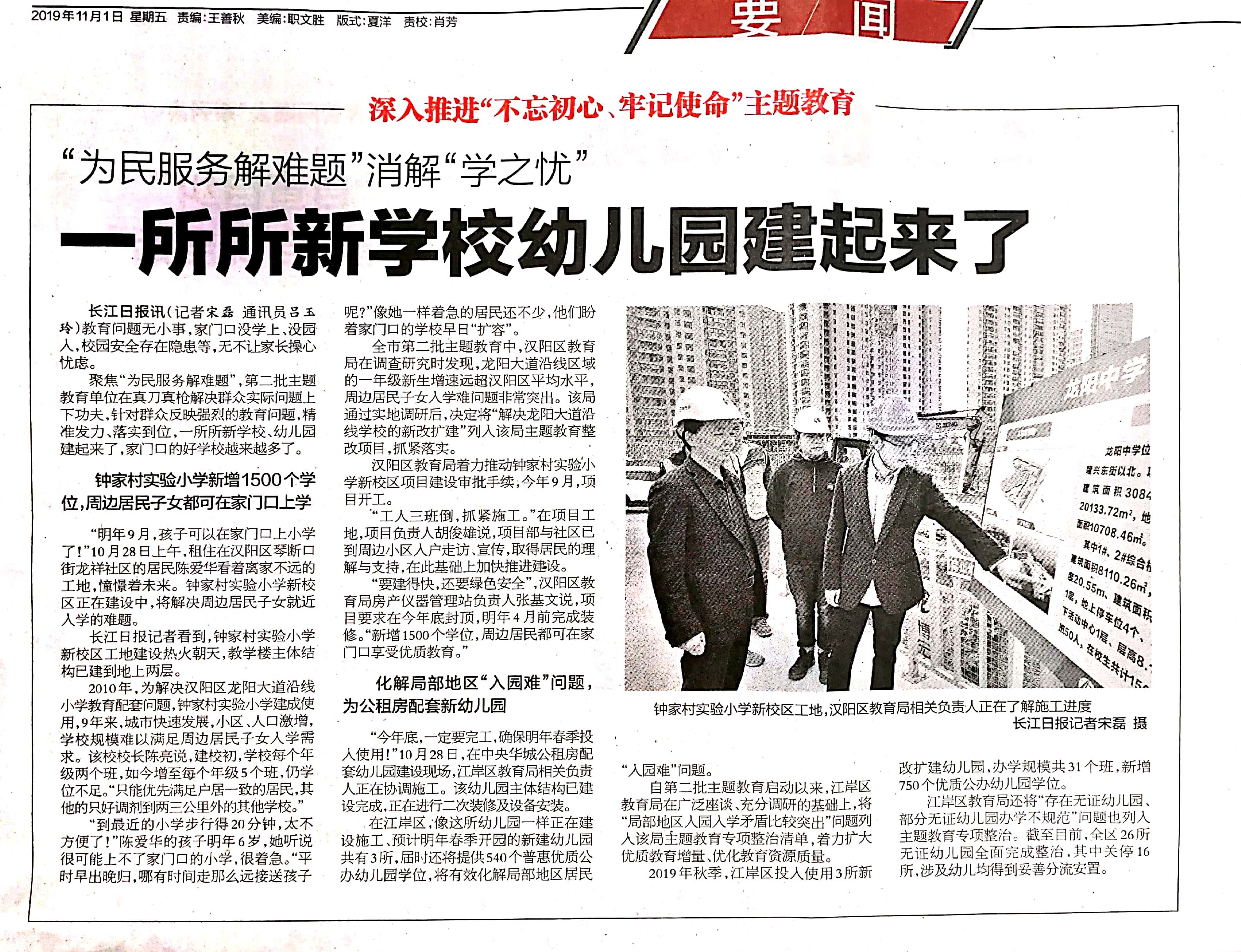 ?????????111日,《長江日報(bào)》以“‘為民服務(wù)解難題’消解‘學(xué)之憂’—一所所新學(xué)校幼兒園建起來了”為題,專題報(bào)道了龍陽中學(xué)項(xiàng)目(該項(xiàng)目建成后35年將作為鐘家村實(shí)驗(yàn)小學(xué)新校區(qū)使用)的在建情況和建設(shè)意義。