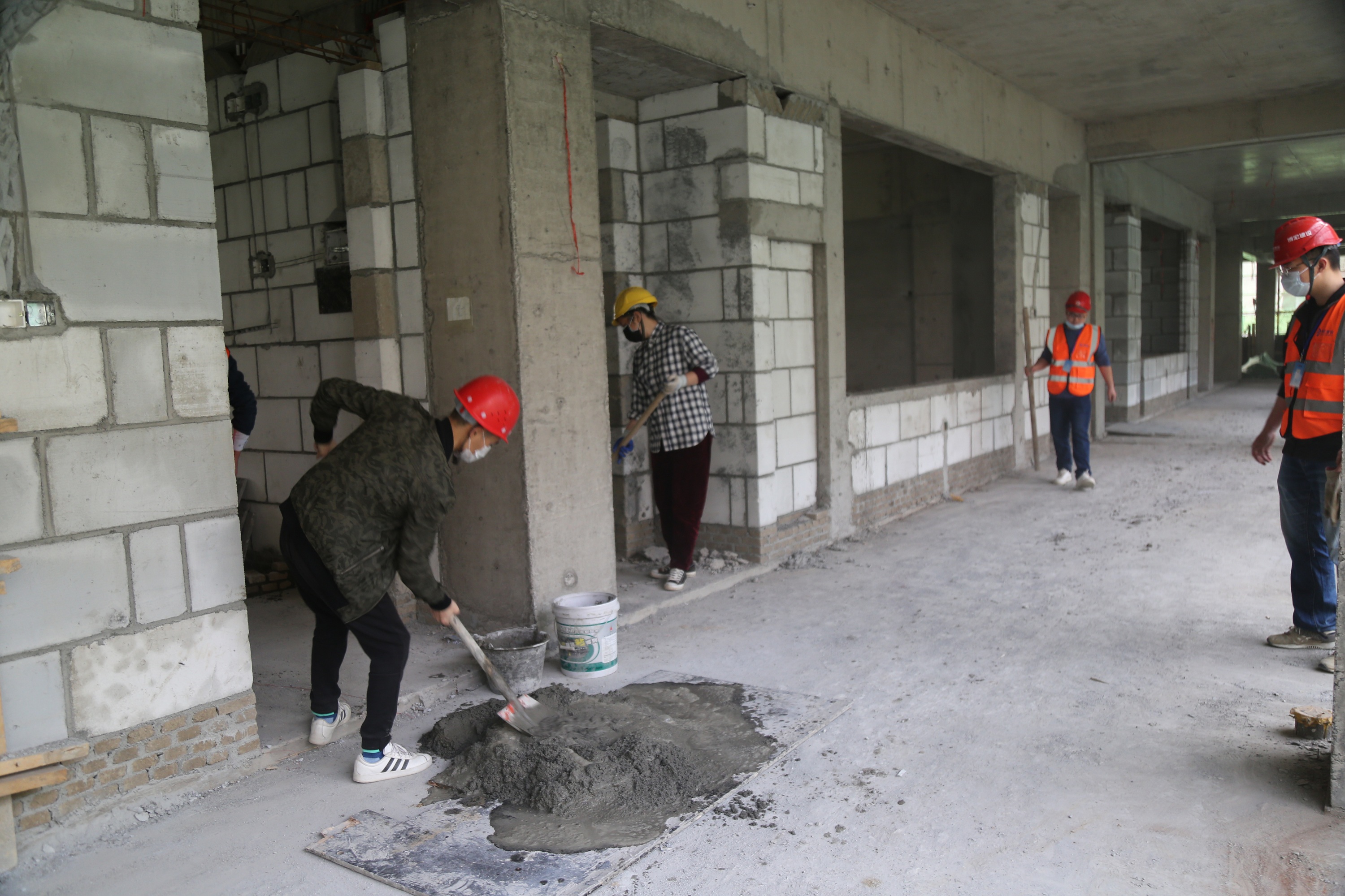 據(jù)項目負(fù)責(zé)人介紹,目前龍陽中學(xué)項目已到崗工人60余人,當(dāng)下主要施工任務(wù)是部分樓棟進行內(nèi)架拆除、砌體施工、水電安裝等。在經(jīng)過嚴(yán)格的場地消毒、進場測溫和登記等防疫程序后,現(xiàn)場管理人員和工人們陸續(xù)進場,一進場大家就忙活起來了,有的及時對地面凹陷進行覆蓋,有的在上樓為墻面砌筑拌灰,旁邊樓棟里也傳來了“當(dāng)當(dāng)當(dāng)”的鋼管架子拆除聲音。大家對期盼已久的復(fù)工都干勁十足,項目起步就是沖刺,開啟“白+黑”兩班倒模式,已連續(xù)兩個夜晚進行施工,誓要把因疫情耽誤的工期盡快趕上。