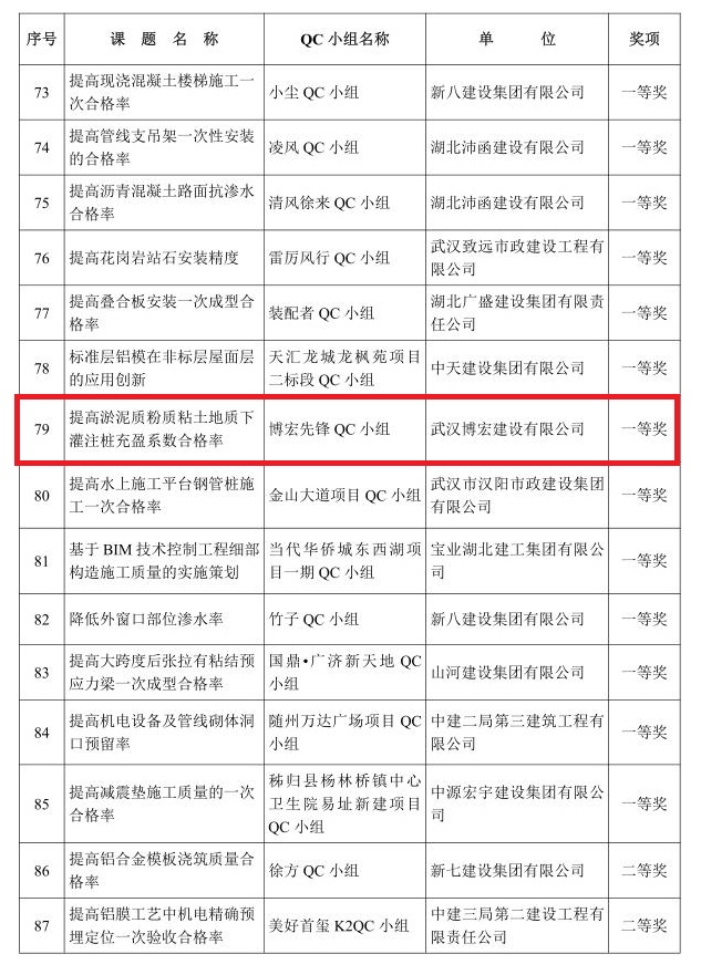 每年,公司都根據各大在建項目的實際情況,針對生產中的難題,從挖潛增效、強化管理等角度確定課題,成立相關技術攻關小組,構思切實可行的質量提升措施,并邀請技術專家對其進行指導完善。本次獲得一等獎的《提高淤泥質粉質粘土地質下灌注樁充盈系數合格率》,在其攻關過程中,“博宏先鋒 QC 小組”制定了嚴格的工作計劃和科學的攻關流程,按月推進,最終形成了一套可復制、可推廣的工作經驗,攻關小組也通過QC活動掌握了一套提升項目管理質量的方法論。